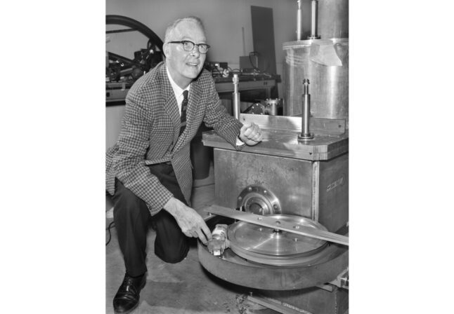 Le physicien Luis Alvarez photographié en avril 1969 à côté d’un détecteur de monopôle magnétique. © Domaine public