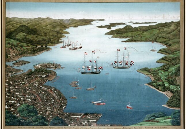 Durant plus de deux siècles, une petite île artificielle située dans la baie de Nagasaki a servi de point de contact unique entre le Japon et l’Occident. Nommée Dejima, elle avait été initialement bâtie en 1634 pour accueillir les marchands portugais qui commerçaient avec ce pays depuis le milieu du XVIe siècle. Sa construction avait été ordonnée par le shogun (chef militaire de l’empereur) Tokugawa Iemitsu, troisième représentant de la dynastie des Tokugawa qui dirigea le Japon jusqu’à la fin du XIXe siècle. En les confinant en un lieu particulier, l’objectif était d’empêcher les Portugais de répandre le christianisme dans le pays. En 1639, à la suite de la révolte de la population d’une région christianisée, ils furent carrément chassés de l’archipel. Le gouvernement Tokugawa déplaça alors à Dejima les commerçants hollandais jusque-là cantonnés sur l’île d’Hirado, à 70 kilomètres au nord-ouest de Nagasaki. Ils y restèrent jusqu’en 1869, seuls Occidentaux autorisés à commercer avec le Japon à côté des Chinois et des Coréens jusqu’à l’ouverture du pays sous pression des États-Unis à la fin du XIXe siècle.